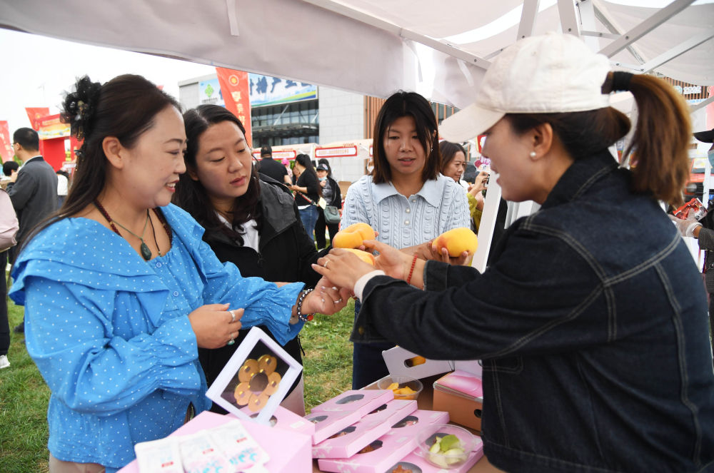 9月19日,北京市平谷區(qū)舉辦2025年中國農(nóng)民豐收節(jié)暨第36屆北京農(nóng)民藝術(shù)節(jié)“鄉(xiāng)村大舞臺”平谷區(qū)專場展演。工作人員(右一)在活動現(xiàn)場向市民介紹農(nóng)產(chǎn)品。新華社記者 任超 攝