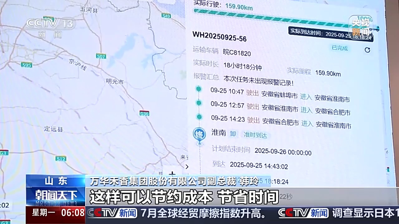 萬華禾香集團股份有限公司副總裁 韓玲:對于固定的線路,我們有大量的數據支撐之后,方便我們的司機對整個運輸的線路做一個最佳路徑的選擇,這樣可以節(jié)約成本,節(jié)省時間。