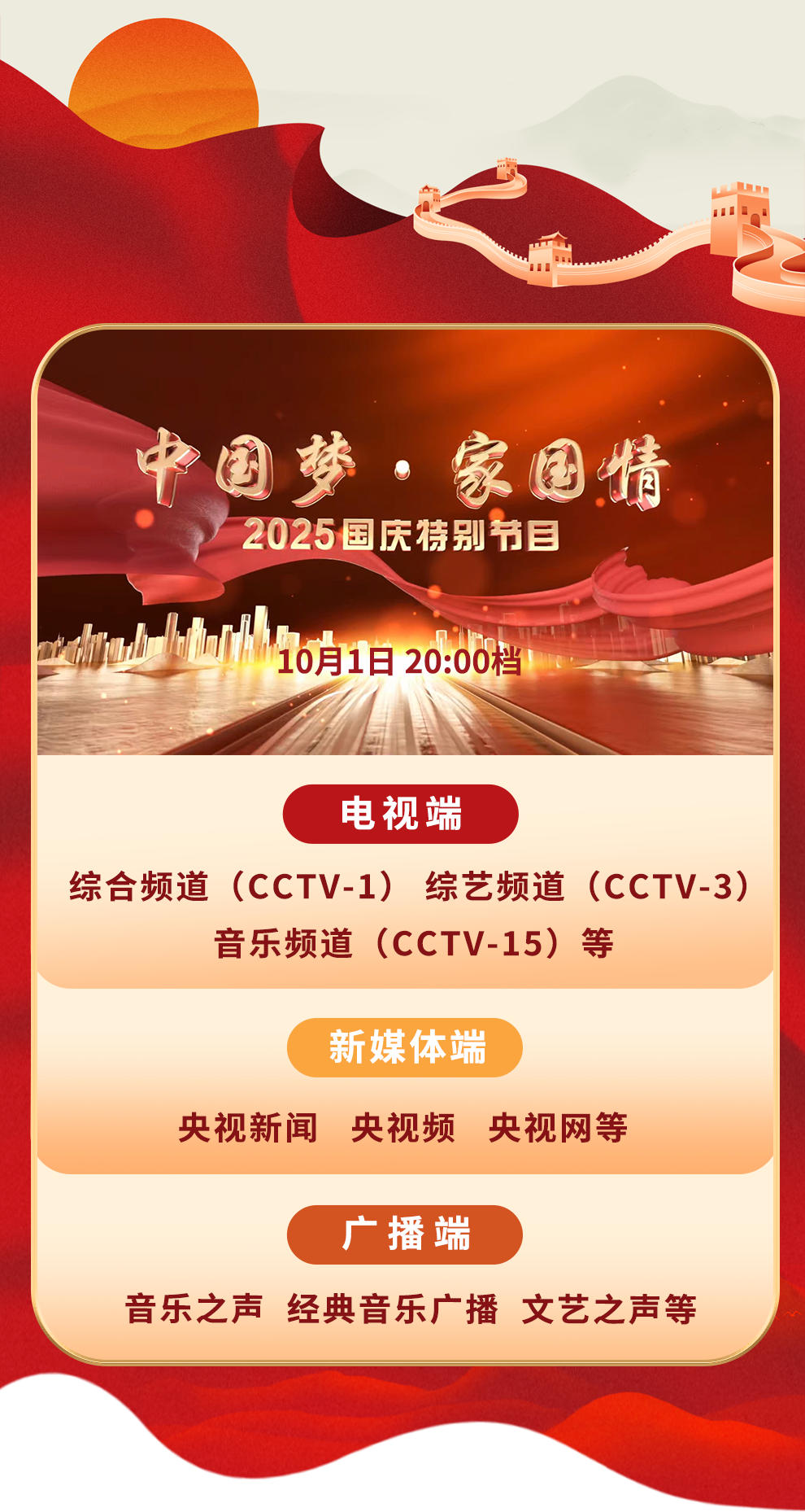 金秋潑彩山河醉,家國同輝氣象新。10月1日晚八點,《中國夢 家國情——2025國慶特別節(jié)目》將在《我愛你中國》的大合唱中拉開大幕。特別節(jié)目走進城市地標與文化遺址,展現(xiàn)山河新貌與奮斗者群像。經(jīng)典曲目、交響合唱、新創(chuàng)歌曲傳遞濃濃家國情懷??箲?zhàn)老兵、奧運冠軍、各行各業(yè)奮斗者深情講述……整場節(jié)目,洋溢著中華民族偉大復(fù)興勢不可擋的壯志豪情。
