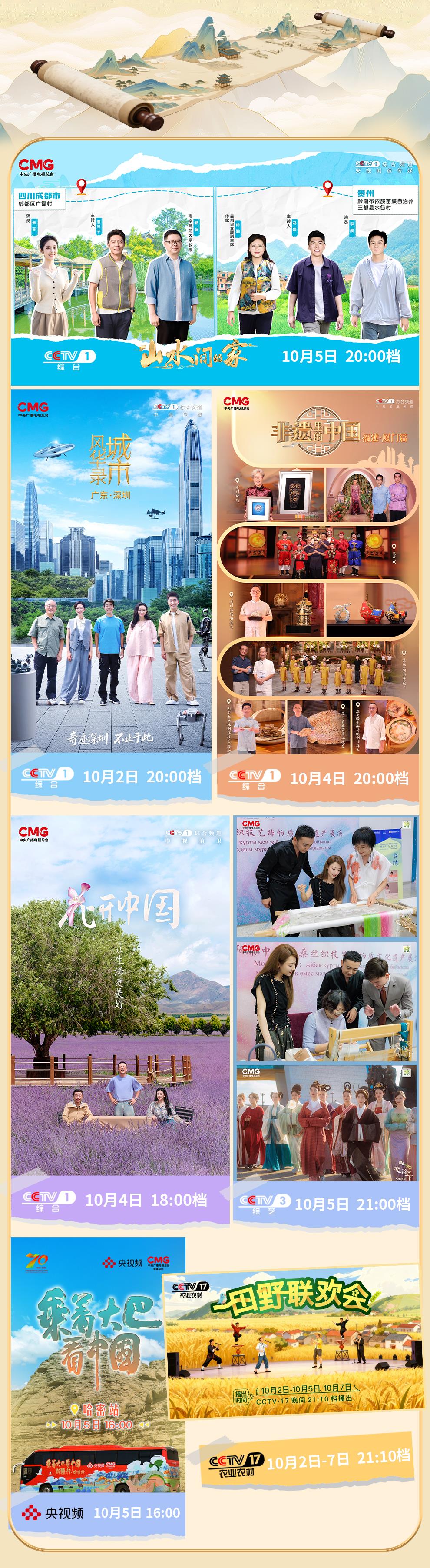 八天假期,想好去哪兒玩了嗎?來,跟著總臺去打卡!頭兩站:四川、貴州!《山水間的家(第四季)》“山水小分隊”邀你在川西林盤探韭香產(chǎn)業(yè),在黔南山鄉(xiāng)看巖椒成林。第三站:廣東。《城市風華錄》帶你去深圳探訪全球首家機器人6S店,感受“奇跡之城”向新向好的澎湃動力。第四站:福建。珠繡、漆線雕、閩南童謠、高甲戲……看《非遺里的中國》,領(lǐng)略廈門非遺之美。第五站:新疆。從《花開中國》開啟一場跨越天山的芬芳之旅,在《衣錦天下 絲路季》發(fā)現(xiàn)絲綢之路上的中國審美,《乘著大巴游中國》探尋哈密甜美密碼。第六站:內(nèi)蒙古。在通遼參加《田野聯(lián)歡會》,體驗鄉(xiāng)土文化新活力。這八天的旅程,你不會錯過雄奇的風光、古老的文化、新奇的創(chuàng)造,還有熱氣騰騰的生活。