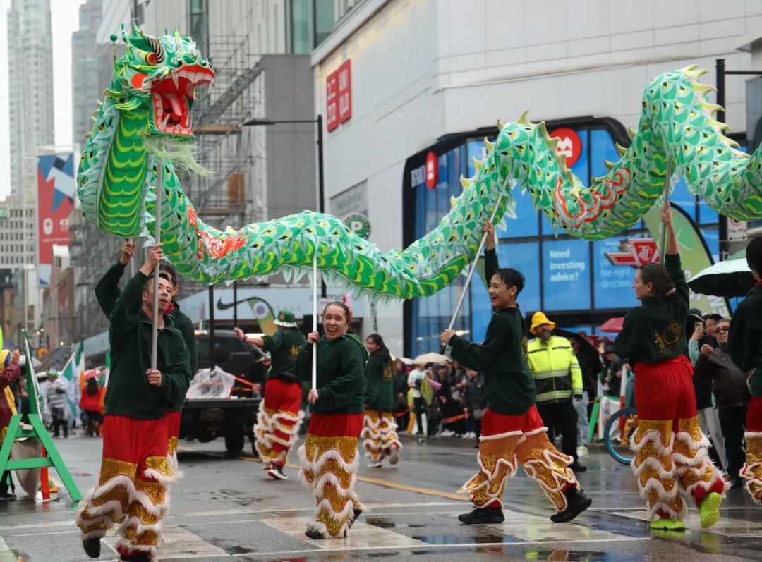 當(dāng)?shù)貢r(shí)間2025年3月16日,加拿大多倫多,在慶祝愛爾蘭民族傳統(tǒng)節(jié)日圣帕特里克節(jié)(St. Patrick’s Day)的大游行中,一支中式舞龍隊(duì)舞動(dòng)綠色長龍。中新社記者 余瑞冬 攝
