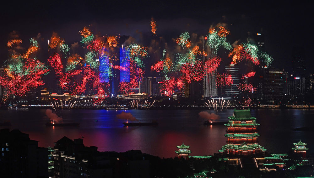 10月1日,2025年南昌市國慶煙花晚會在江西省南昌市贛江老官洲水域舉辦。新華社記者 萬象 攝