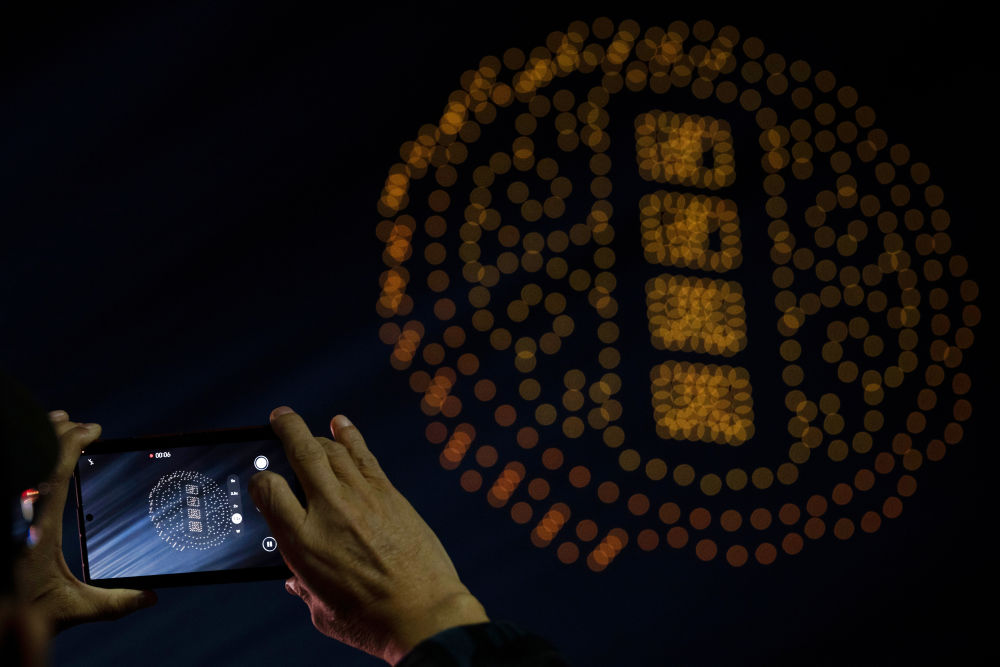 10月6日,游客在黑龍江哈爾濱冰雪大世界園區(qū)拍攝無人機(jī)表演。新華社記者 張濤 攝