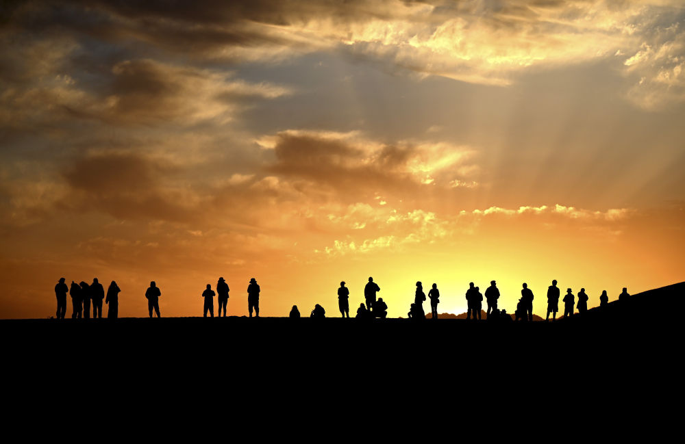 這是10月2日清晨,游客在甘肅省敦煌市鳴沙山月牙泉景區(qū)觀賞大漠日出美景。新華社發(fā)(張曉亮 攝)