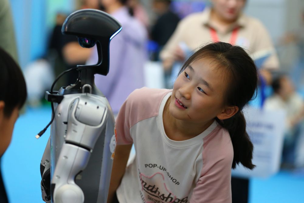 10月2日,在山東省第九屆滕州書展現(xiàn)場,小朋友與機(jī)器人互動。新華社發(fā)(李志軍攝)