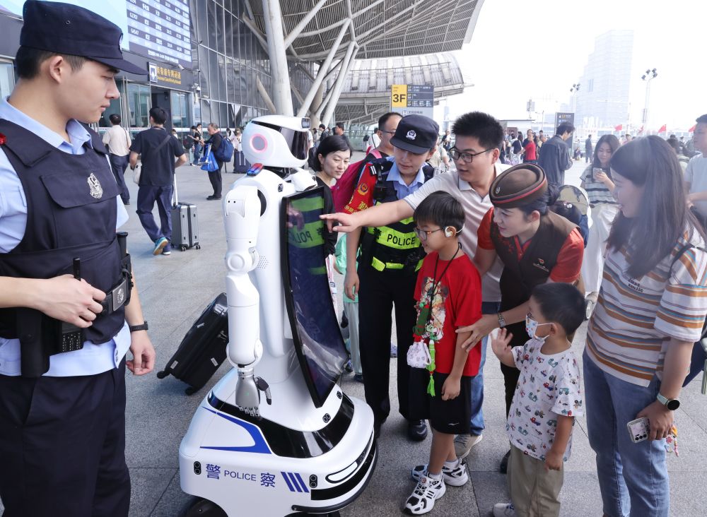10月1日,在湖北省武漢站,小朋友和機(jī)器人互動。新華社發(fā)(趙軍攝)