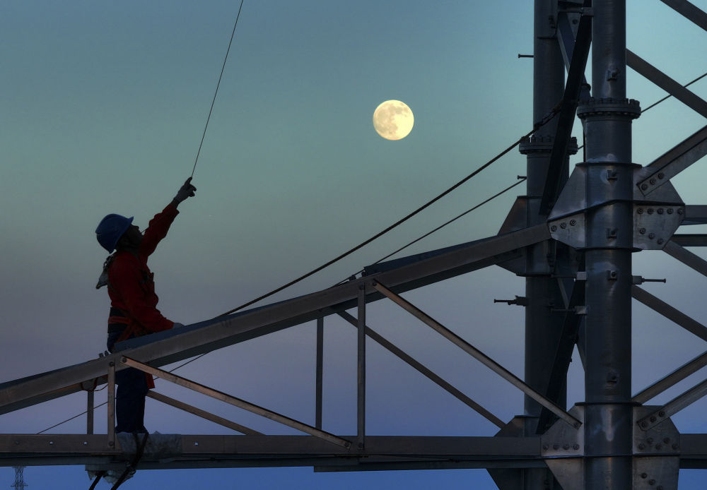 10月6日,在湖南省衡陽市雁峰區(qū),高塔架線工人在月光的映射下施工(無人機(jī)照片)。新華社發(fā)(曹正平攝)