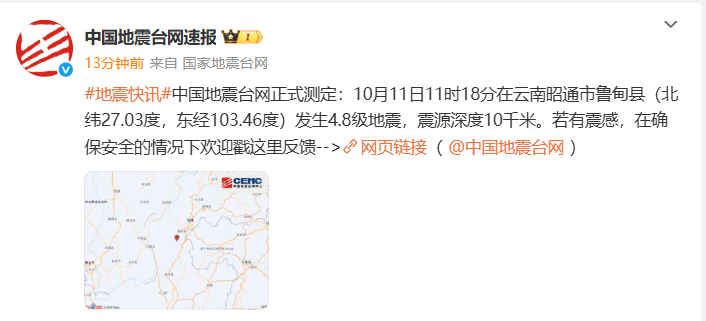 中國地震臺(tái)網(wǎng)正式測(cè)定:10月11日11時(shí)18分在云南昭通市魯?shù)榭h(北緯27.03度,東經(jīng)103.46度)發(fā)生4.8級(jí)地震,震源深度10千米。