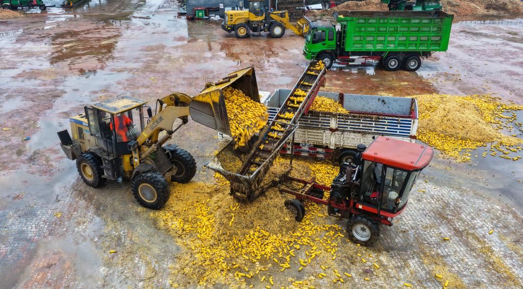 在山東省東營(yíng)市廣饒縣一家糧食收儲(chǔ)企業(yè),工作人員在裝運(yùn)玉米進(jìn)行脫粒(無(wú)人機(jī)照片)。(劉云杰 攝)