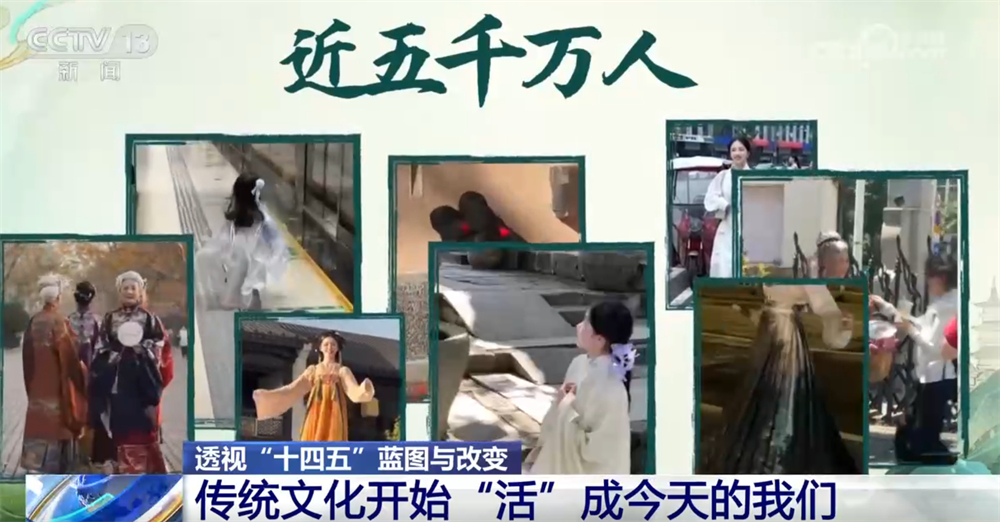央視網(wǎng)消息:過去,我們在課本里背古詩、學歷史;今天,我們身著漢服走上街頭,在旅行打卡、短視頻創(chuàng)作中重新感受傳統(tǒng)。五千年的文化正在從書頁走向街頭,從展廳走進生活,成為我們?nèi)粘5囊徊糠?。“十四五”的五年,讓文化真正“活”在了當下,也“活”進了我們的生活。