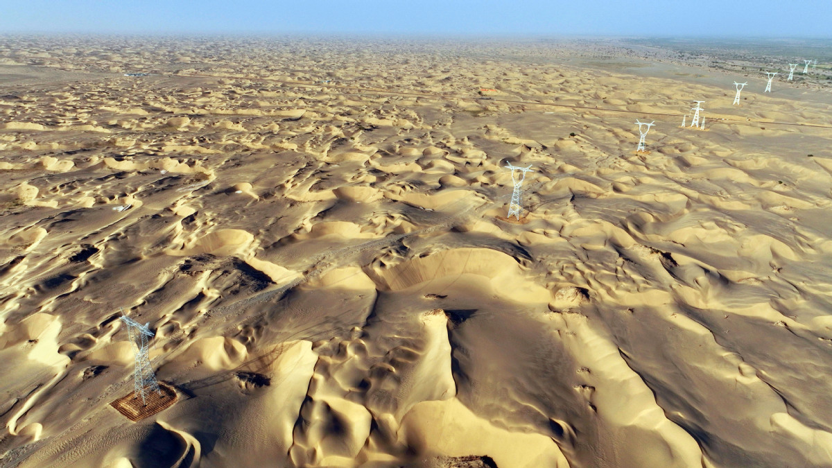 2025年6月25日,民豐—且末—若羌750千伏輸電線(xiàn)路工程穿越“死亡之?!彼死敻缮衬#R元 攝)