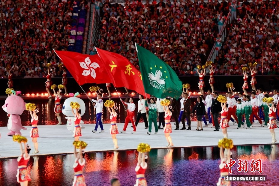 11月9日晚,第十五屆全國運(yùn)動(dòng)會(huì)開幕式在廣東奧林匹克體育中心舉行。圖為東道主廣東、香港、澳門體育代表團(tuán)同時(shí)入場。中新社記者 富田 攝