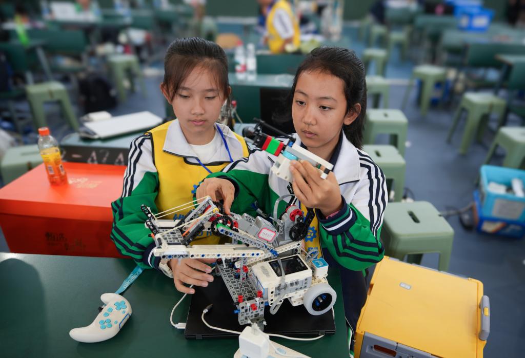 5月31日,兩名參賽選手在全國青少年科技教育成果展示大賽云南省區(qū)域賽上調試比賽用的機器人。新華社記者 陳欣波 攝