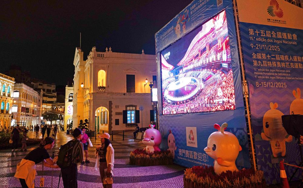 11月9日,群眾在澳門議事亭前地觀看第十五屆全國運(yùn)動會開幕式直播。