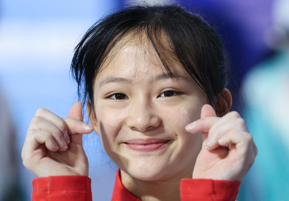 11月15日,廣東隊選手李美妮在女子攀石頒獎儀式前。