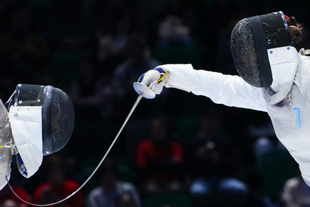 11月20日,江蘇隊選手霍興欣(左)和廣東隊選手吳培林在女子花劍團(tuán)體銅牌賽中。