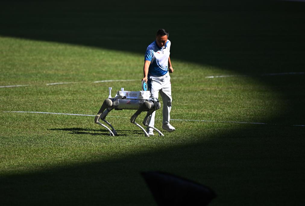 11月16日,在田徑男子十項全能鐵餅比賽中,機(jī)器人在運(yùn)送鐵餅。