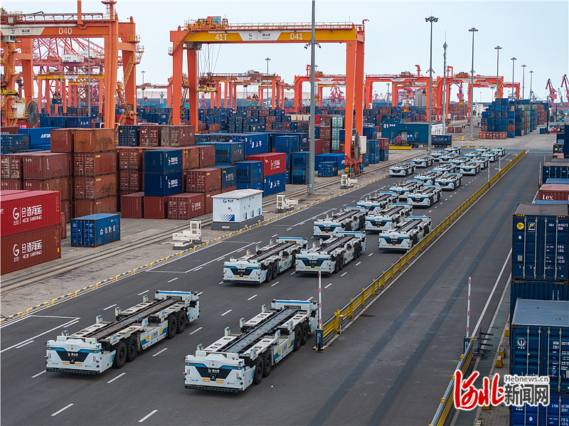 近日,唐山港京唐港區(qū),集裝箱碼頭堆場上智能平板運(yùn)輸車整裝待發(fā)。 河北日報記者趙杰攝