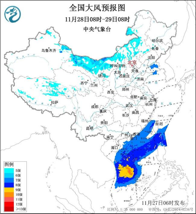 預(yù)計(jì),11月27日08時至28日08時,新疆東部、內(nèi)蒙古中西部、甘肅西部、寧夏北部、山東半島、江蘇沿海以及青海西南部、西藏中西部等地有5~7級大風(fēng),陣風(fēng)8~9級,其中新疆東部山口地區(qū)、內(nèi)蒙古西部部分地區(qū)風(fēng)力可達(dá)8級,陣風(fēng)9~10級;11月27日08時至28日08時臺灣海峽、巴士海峽、南海北部和中東部海域?qū)⒂?級、陣風(fēng)9級的東北風(fēng),其中南海中西部和西南部海域的風(fēng)力可達(dá)10級、陣風(fēng)11級,南海中東部海域的風(fēng)力可達(dá)9級、陣風(fēng)10級,南海東南部海域?qū)⒂?級、陣風(fēng)9級的東南風(fēng)。