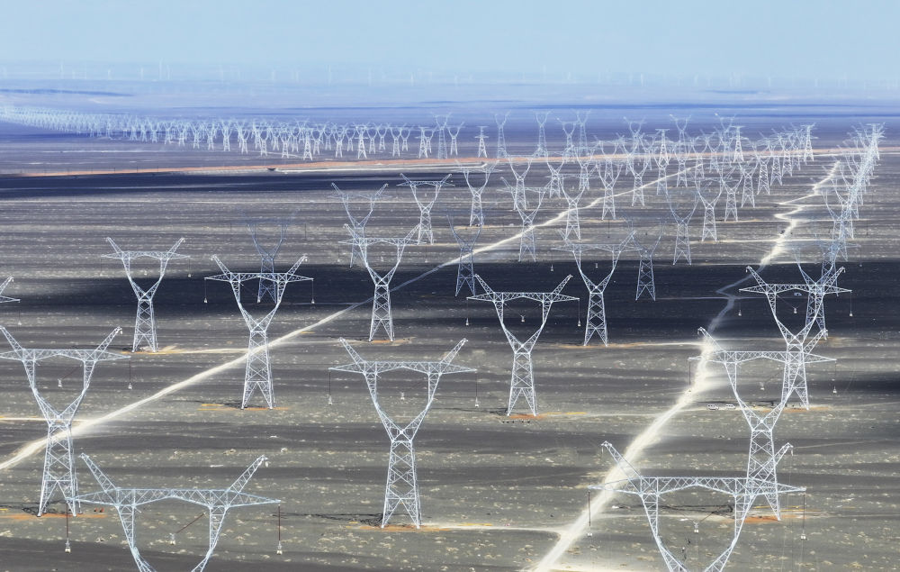 這是2025年4月24日在新疆哈密地區(qū)三塘湖鎮(zhèn)附近拍攝的“疆電入渝”特高壓工程(無人機(jī)照片)。新華社記者 王菲 攝