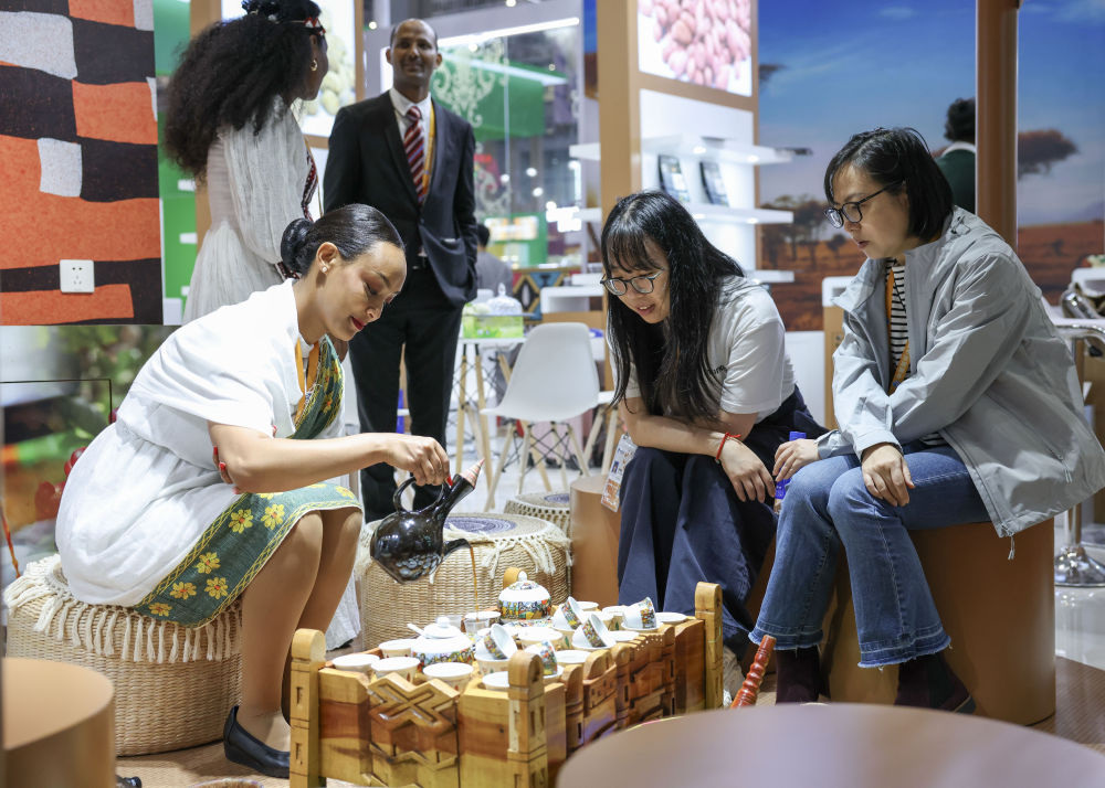 2025年11月7日,人們?cè)诘诎藢眠M(jìn)博會(huì)國家展埃塞俄比亞館品嘗咖啡。新華社記者 孟晨光 攝
