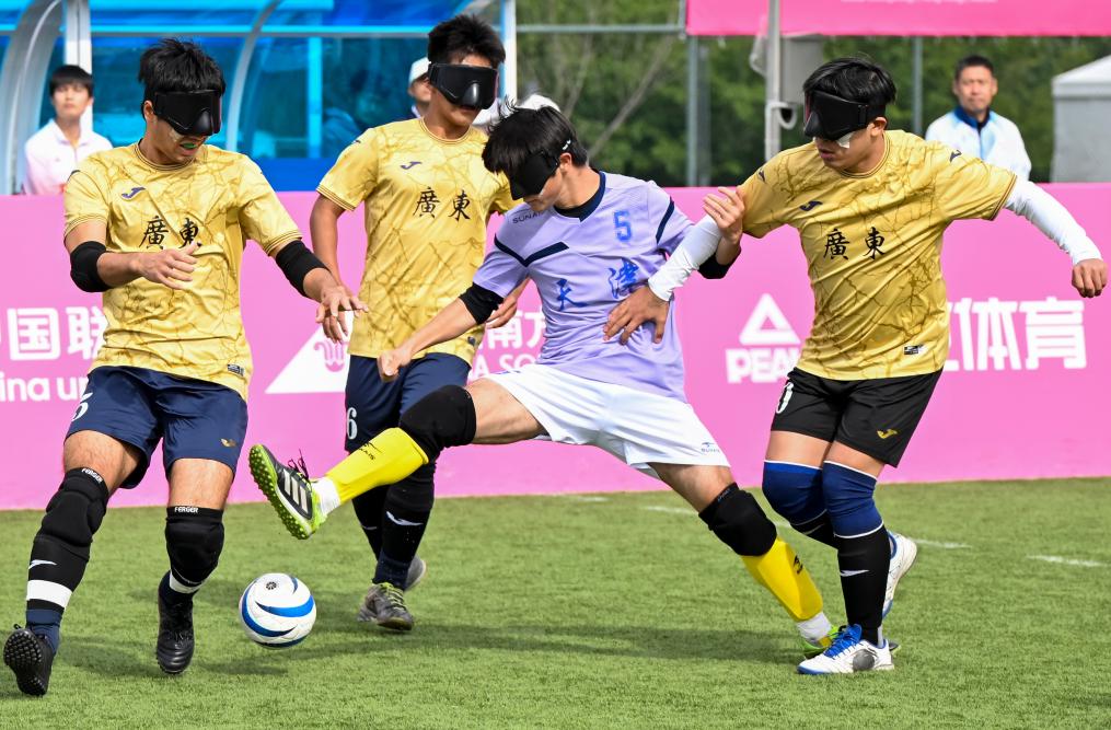 12月14日,在廣州舉行的全國第十二屆殘疾人運動會暨第九屆特殊奧林匹克運動會盲人足球項目男子組小組賽中,天津隊1:0戰(zhàn)勝廣東二團(tuán)隊。圖為天津隊球員范海林(右二)在比賽中突破。新華社記者 陳浩明 攝