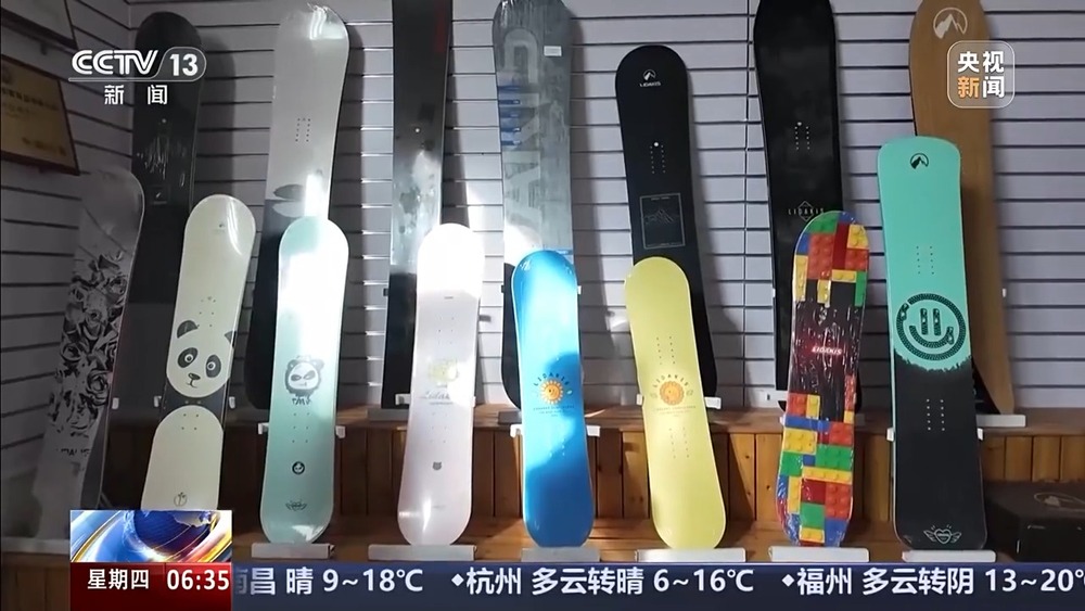 某冰雪裝備生產(chǎn)企業(yè)負責(zé)人 靳惠媛:2002年的時候,我正好是做外貿(mào)生意,趕上一個冬博會,走到一個展位上,全是板子。那時候沒有見過這樣的滑雪板。他說剛剛進入中國,在國外特別流行了,就進貨了10塊單板。