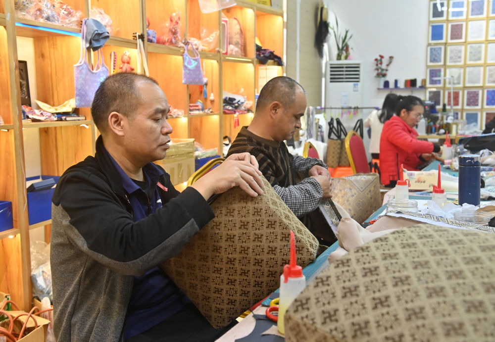 在廣西賓陽壯錦文創(chuàng)館,工人制作壯錦文創(chuàng)產(chǎn)品。廣西賓陽縣有著悠久的壯錦生產(chǎn)歷史。近年來,該縣在傳統(tǒng)壯錦生產(chǎn)的基礎(chǔ)上,積極推動壯錦文創(chuàng)產(chǎn)業(yè)發(fā)展,拓寬了當?shù)貏趧泳蜆I(yè)渠道。新華社記者 陸波岸 攝