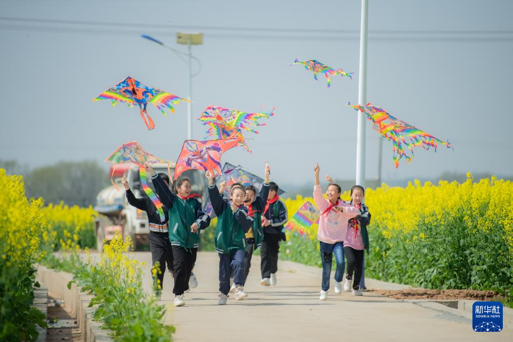 2023年3月10日,孩子們?cè)跒g陽市永安鎮(zhèn)豐裕村放風(fēng)箏。新華社發(fā)