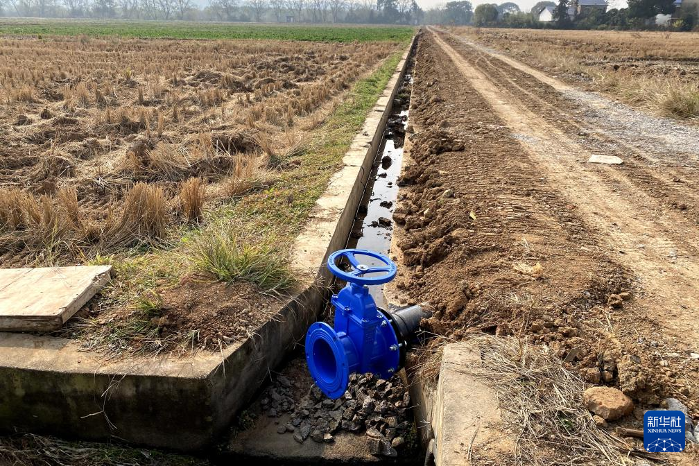 田埂上,新鋪設(shè)完工的灌溉管網(wǎng)開閘,水流噴涌而出。