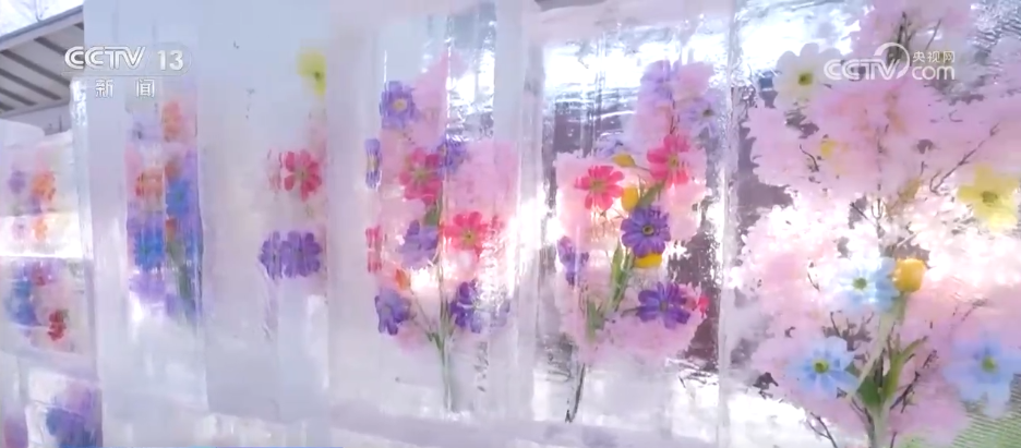 看完了霧凇,剛才說到的冰雕在哪里呢?大家看這面鮮花冰墻就是進(jìn)入冰雕觀賞區(qū)的標(biāo)志:它以冰塊為載體,嵌入了青海本土的郁金香、格桑花,還有西寧市花丁香花,嬌艷色彩與冰晶的純凈相互映襯。