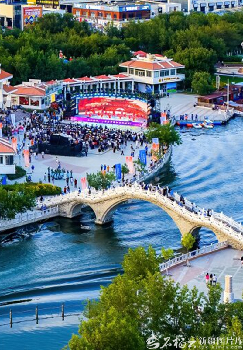 克拉瑪依河景區(qū)華燈初上、夜景璀璨,吸引了眾多納涼的市民和游客駐足觀賞(2025年7月24日攝)。 閔勇攝