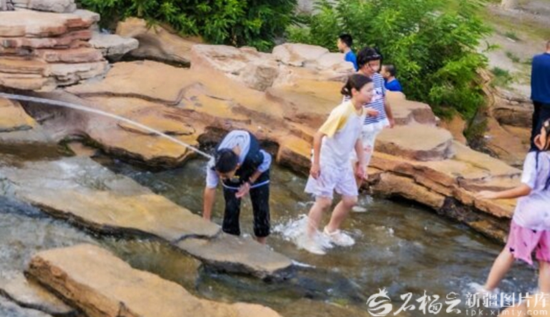 克拉瑪依市金龍湖景區(qū),游客在溪邊嬉水玩耍(2025年7月10日攝)。田國(guó)建攝