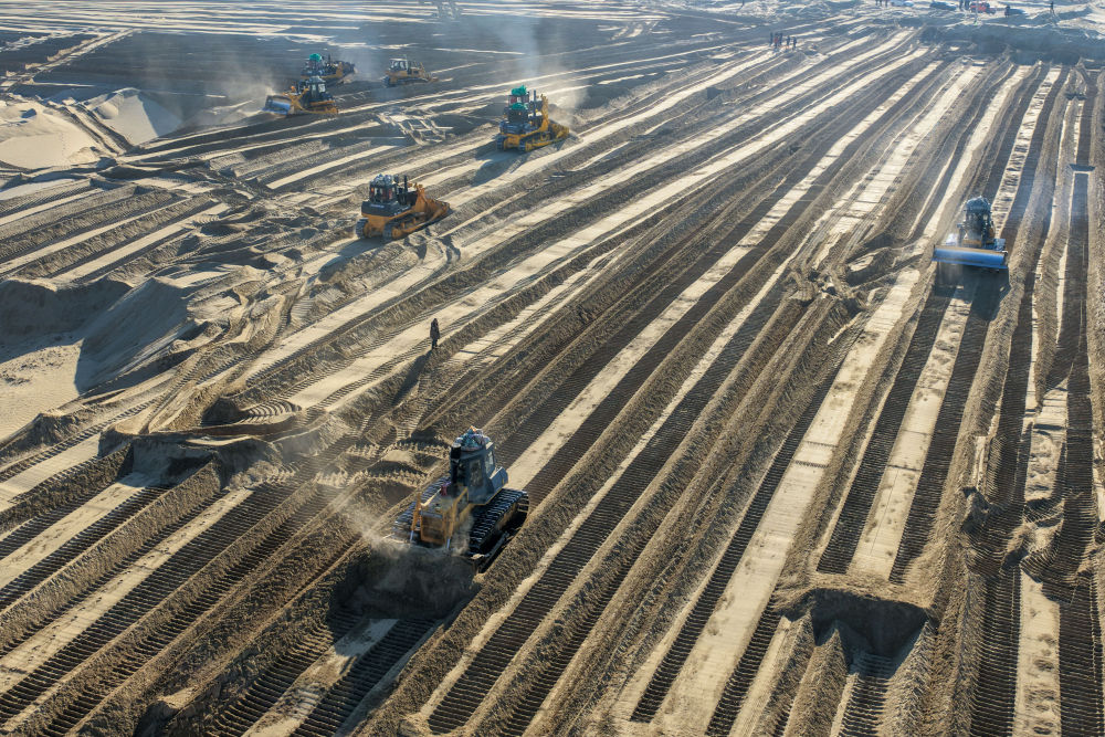 隆冬時節(jié),塔克拉瑪干沙漠西南緣的新疆和田地區(qū)墨玉縣,治沙現場熱火朝天。數十臺推土機轟鳴著向沙漠腹地挺進,起伏的沙丘漸趨平整;不遠處,一束束干蘆葦被嵌入沙層,縱橫交錯的草方格如同堅實的“沙漠鎖扣”,牢牢鎖住流動黃沙。