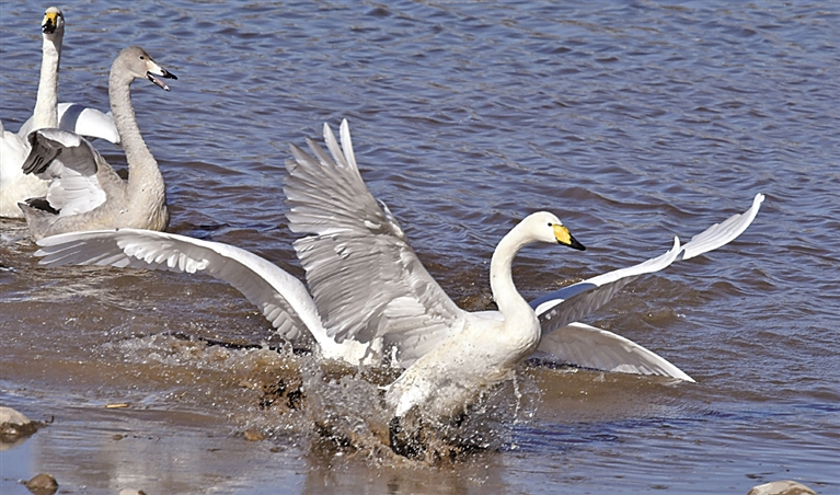天鵝在北京密云水庫(kù)流域的清水河中嬉戲。新華社發(fā)
