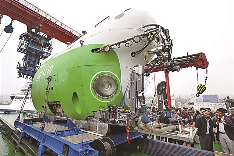 在??坑谥抢胁客郀柵寥R索港的中國(guó)“探索一號(hào)”科考船上,人們參觀“奮斗者”號(hào)載人潛水器。新華社發(fā)