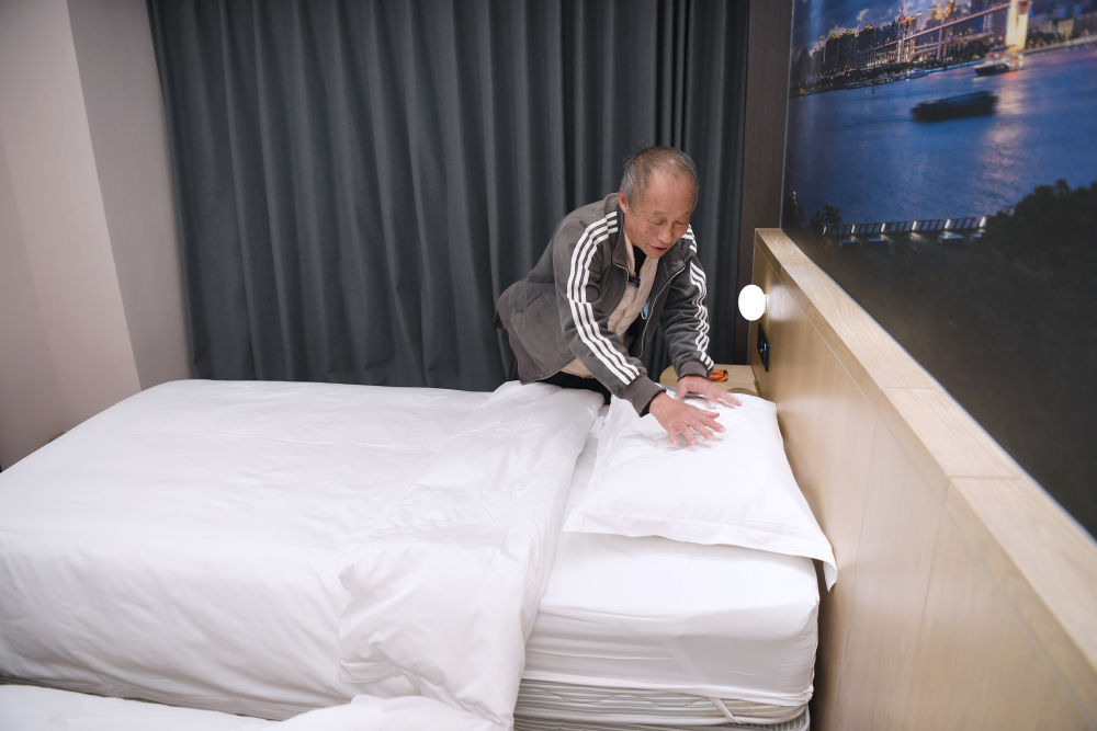 2025年11月28日,宏福苑居民鄺佩麟在粵海酒店“愛心客房”里整理床鋪。新華社記者 陳鐸 攝