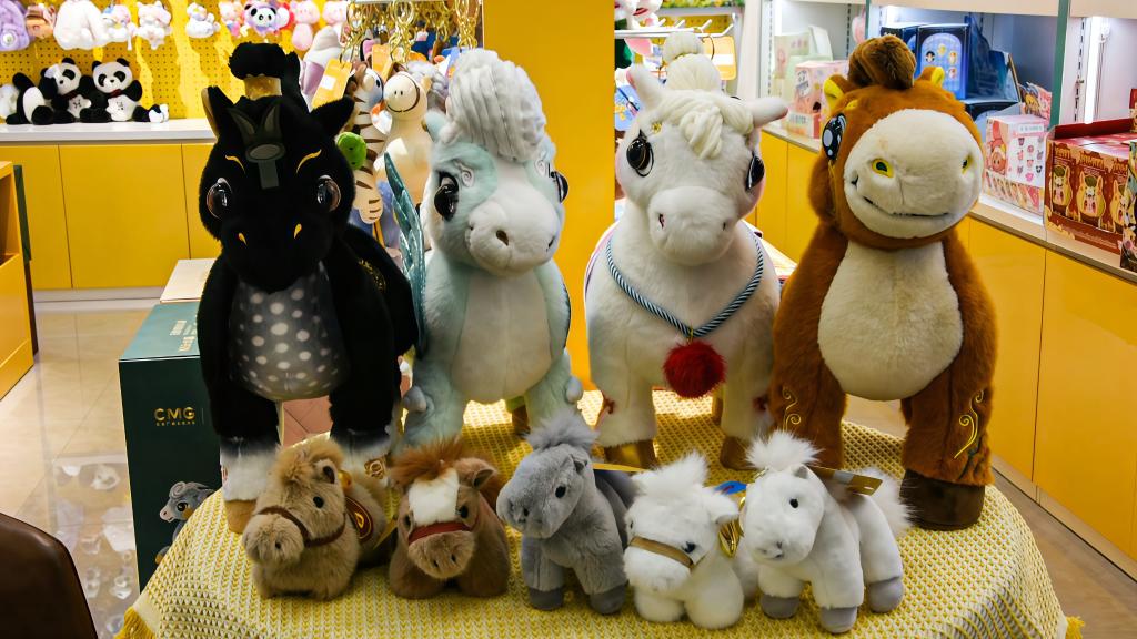 浙江義烏國際商貿城六區(qū)的“萌玩匯”店鋪內,各種以“馬”為造型的公仔幾乎占據半壁江山。其中雙手抱胸、表情傲嬌的“傲嬌馬”公仔,棗紅色、身上印著金色“發(fā)”字和銅錢圖案的“馬上有錢”公仔頗受歡迎。