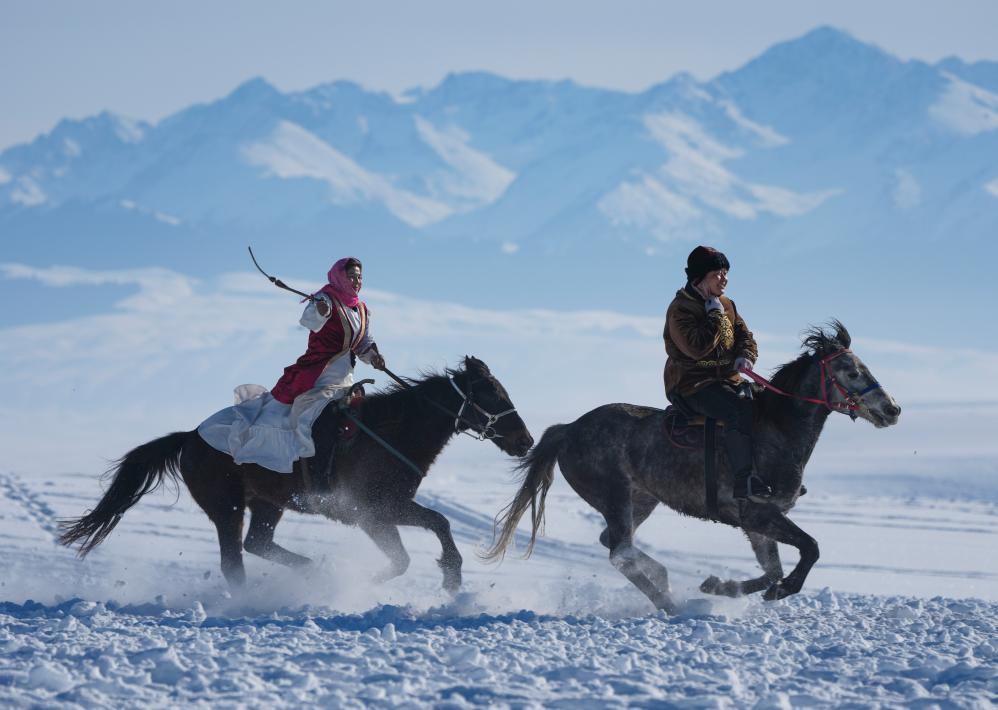 西陲天山,雪峰逶迤。被譽為“天馬故鄉(xiāng)”的新疆伊犁昭蘇縣,在南腔北調的歡呼聲中,演員們騎馬行進在銀裝素裹的濕地公園,載歌載舞表演牧區(qū)傳統(tǒng)婚禮。興之所起,游客與演員共舞一曲,熱鬧非凡。