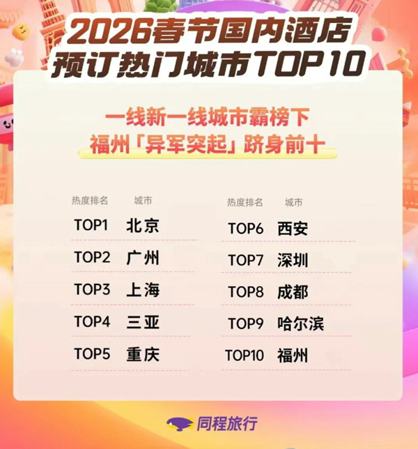 同程旅行數(shù)據(jù)顯示,春節(jié)國內(nèi)酒店預(yù)訂熱門城市TOP10榜單,基本被一線、新一線城市霸榜,但“國家歷史文化名城”福建福州闖出一席之地,躋身第10名。2025年,三坊七巷、煙臺山、上下杭等3個街區(qū)全年接待游客超5500萬人次,創(chuàng)歷史新高。