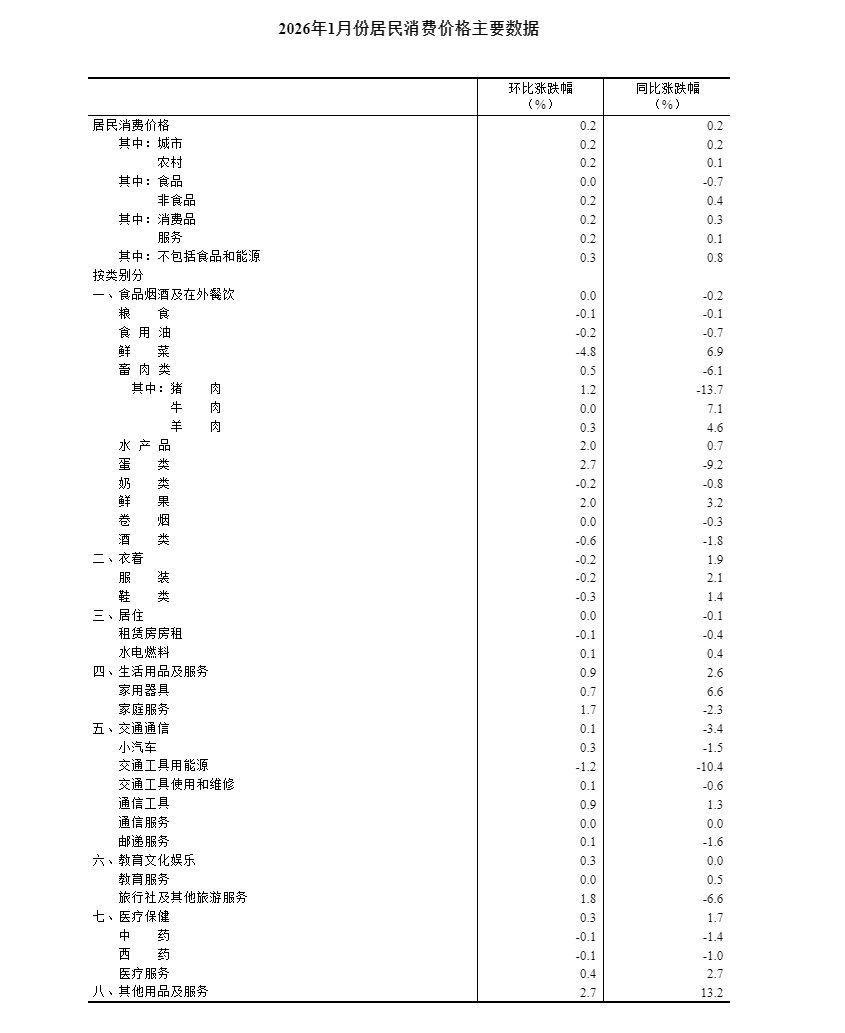 2026年1月份,全國居民消費(fèi)價(jià)格同比上漲0.2%。其中,城市上漲0.2%,農(nóng)村上漲0.1%;食品價(jià)格下降0.7%,非食品價(jià)格上漲0.4%;消費(fèi)品價(jià)格上漲0.3%,服務(wù)價(jià)格上漲0.1%。