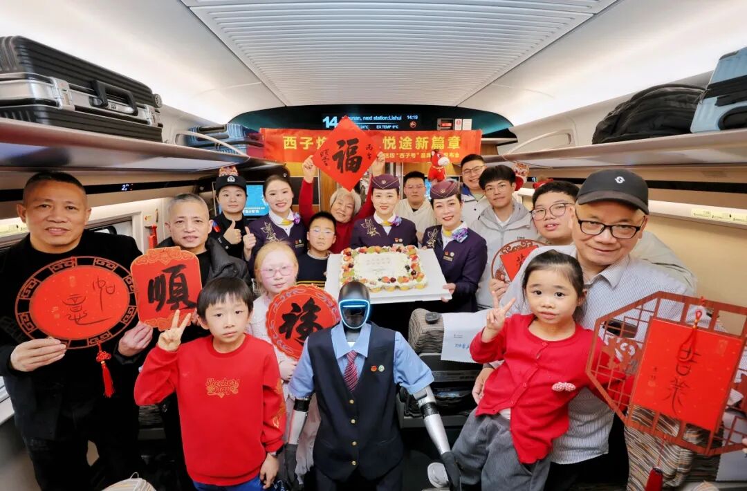旅客在G41次列車上與機(jī)器人及乘務(wù)員合影。