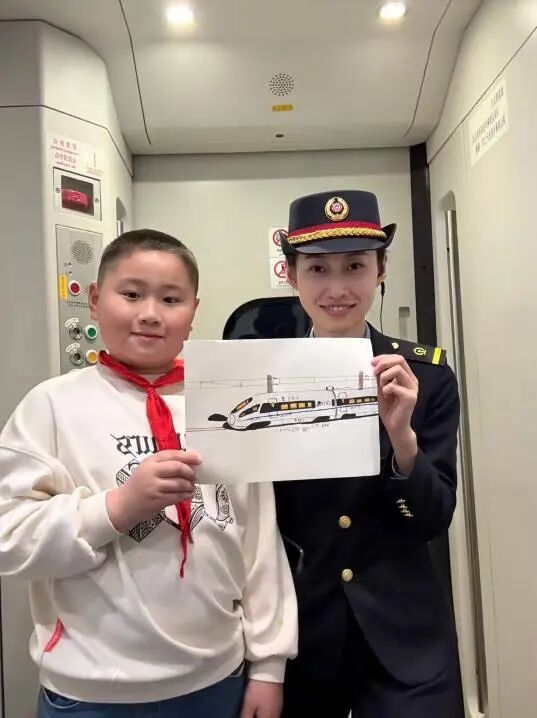 系著紅領(lǐng)巾的小旅客,雙手捧著一幅自己手繪的高鐵畫,遞到了列車長面前。畫面上的列車線條流暢、細(xì)節(jié)生動(dòng),黑黃相間的車身仿佛正帶著少年的憧憬向前飛馳。列車長笑著接過這份沉甸甸的心意,與少年并肩站在一起,共同舉起畫作。
