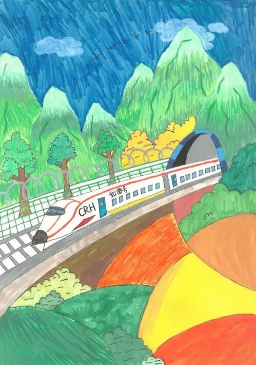 列車穿行青山間。(作者:馨馨小朋友 9歲)