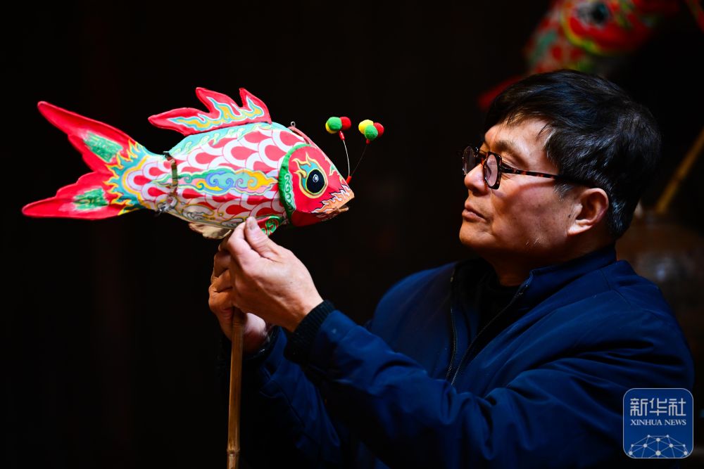 1月29日,瞻淇村的市級(jí)非遺項(xiàng)目魚燈代表性傳承人汪近午在制作魚燈。