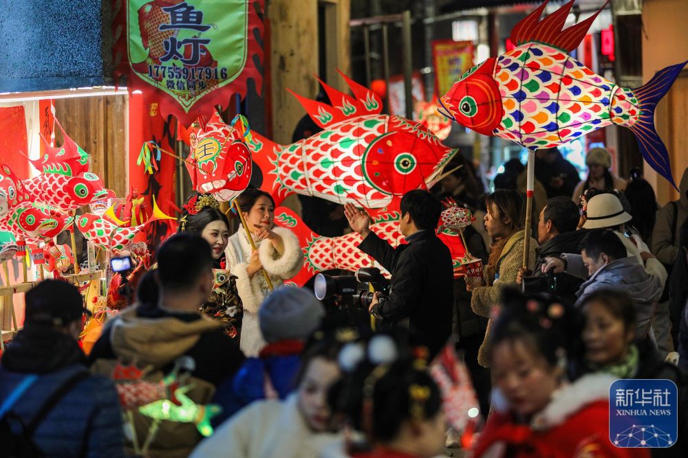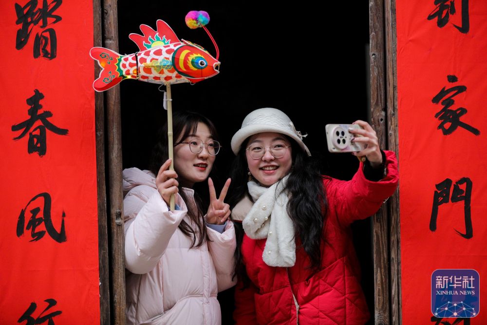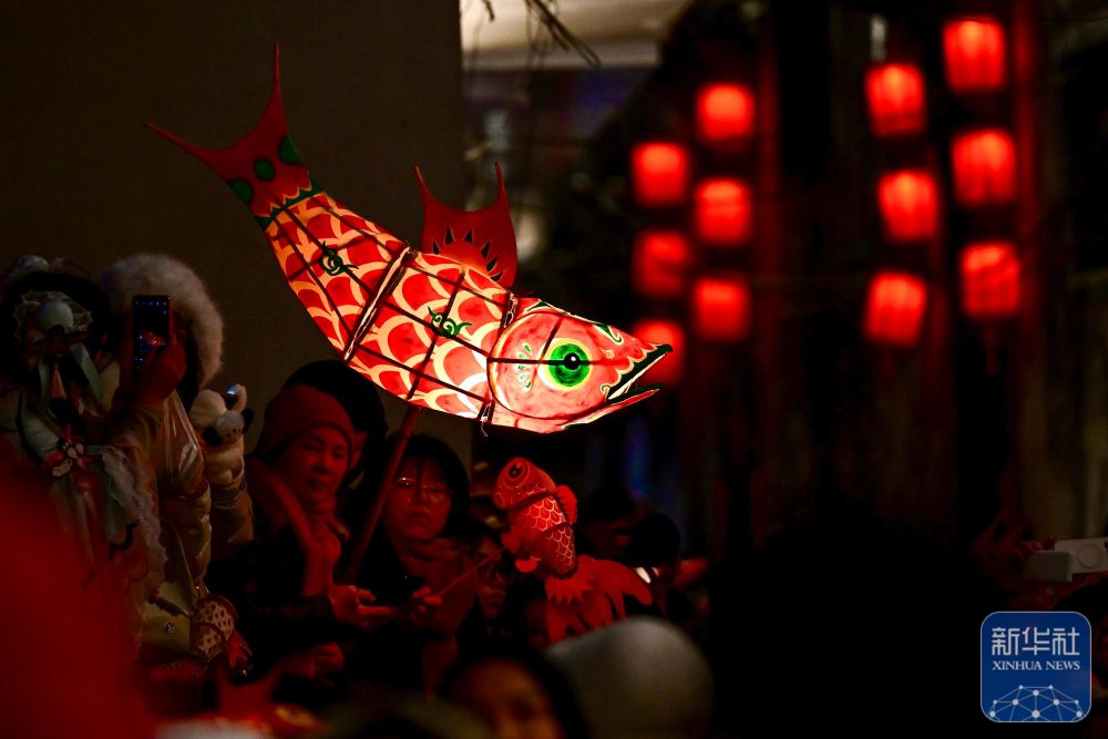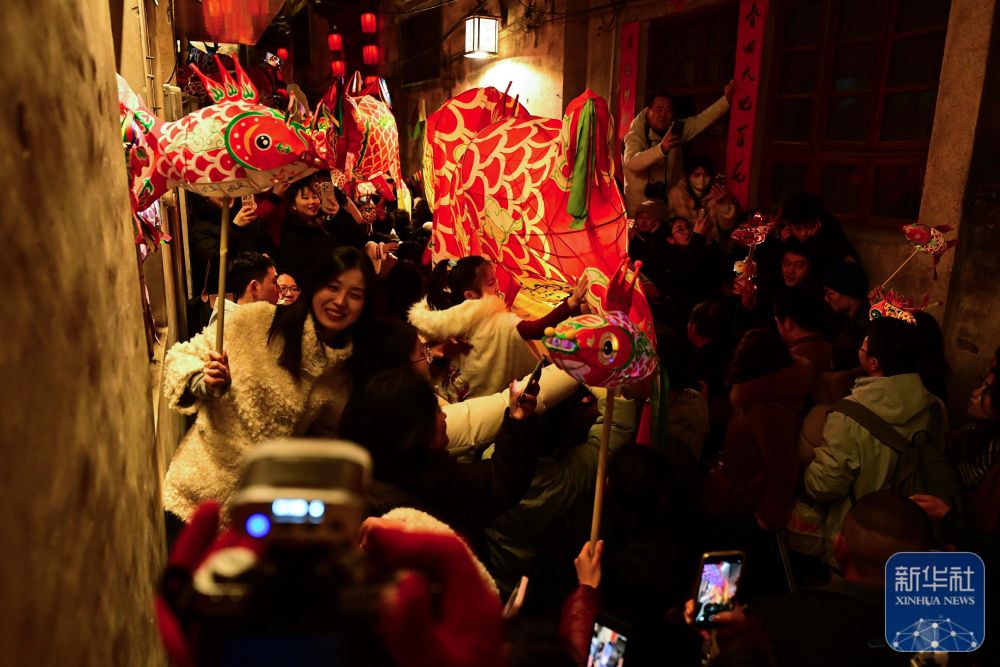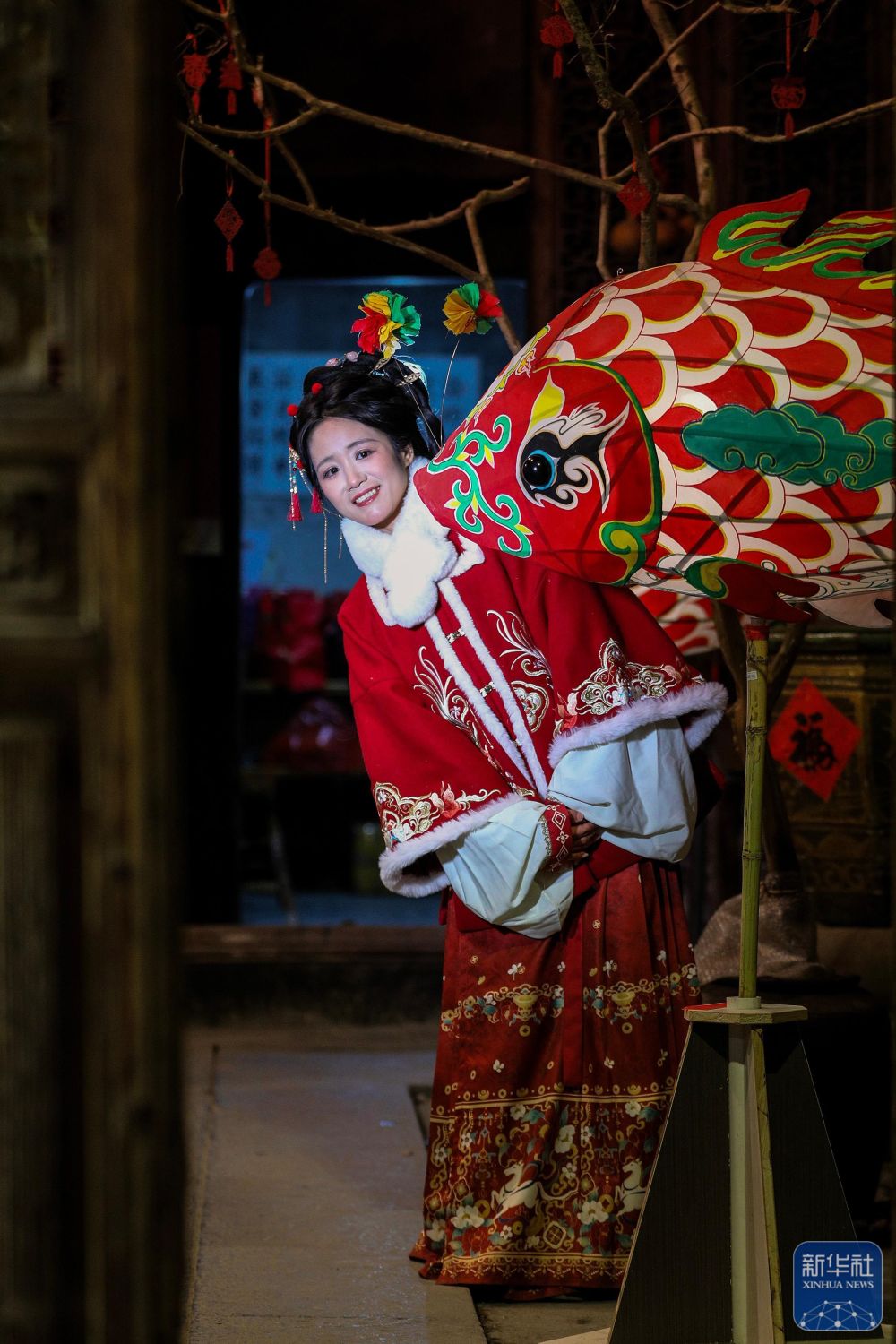 2月7日,游客在瞻淇村里體驗(yàn)魚燈表演。