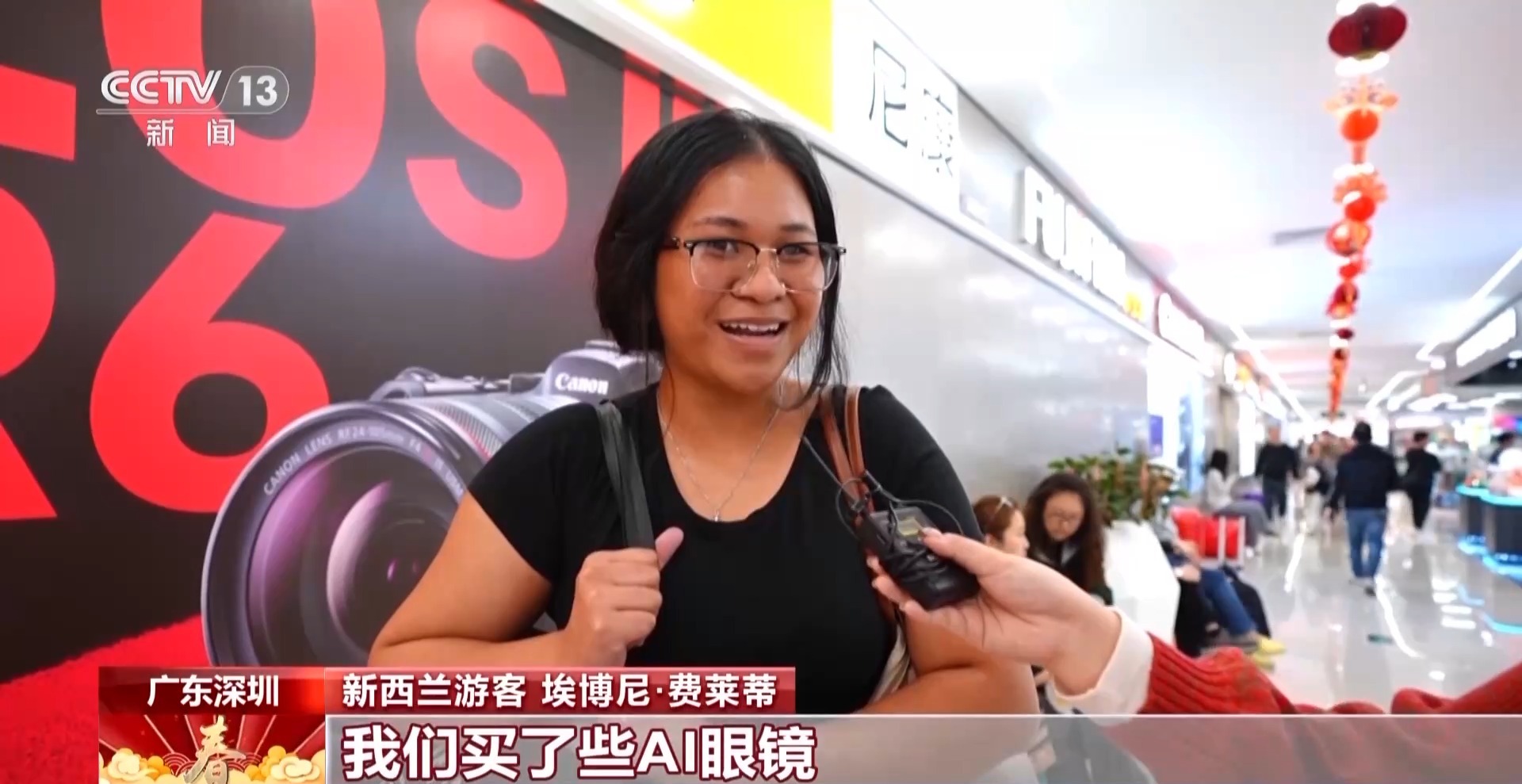 新西蘭游客 埃博尼·費(fèi)萊蒂:我們買(mǎi)了些AI眼鏡,它讓我們?cè)谶@里溝通交流變得更方便,這對(duì)我們是很大的幫助。