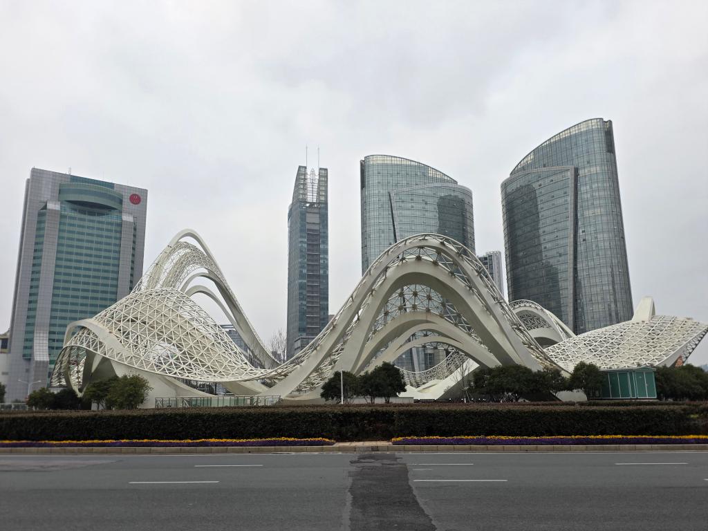 2月17日,武漢光谷廣場上的“星河”雕塑。新華社記者汪平 攝