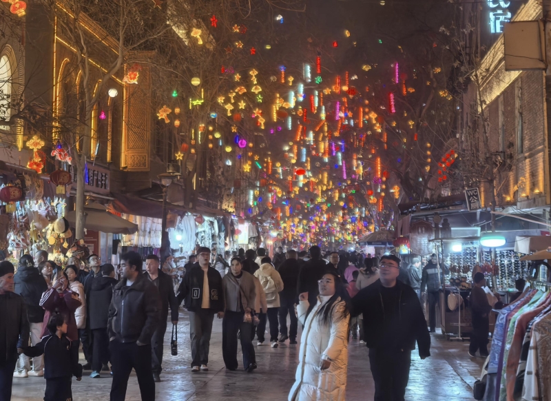 春節(jié)期間,喀什古城相繼舉辦社火巡游、英歌舞表演、篝火晚會(huì)等特色展演活動(dòng),吸引眾多游客參與體驗(yàn)?!拔覀兿氚研麓旱淖8鬟f給在場的每一個(gè)人?!毖輪T奧斯曼·克熱木說,“借著這份熱鬧,祝愿大家新的一年順順利利、紅紅火火,也希望讓更多人看到我們傳統(tǒng)民俗的魅力。”