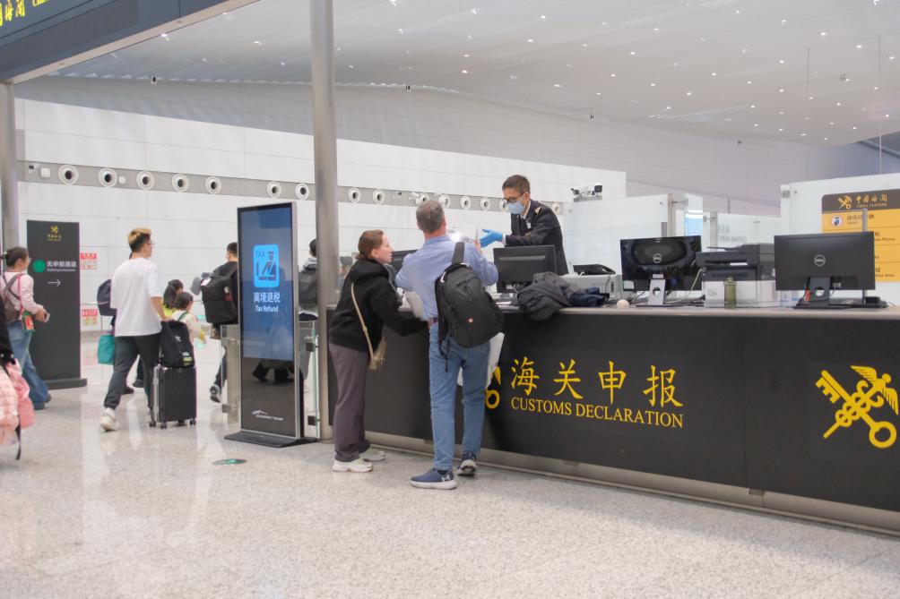 2月23日,廣州白云機(jī)場海關(guān)關(guān)員在出境申報(bào)臺為旅客辦理離境退稅驗(yàn)核業(yè)務(wù)。(受訪者供圖)